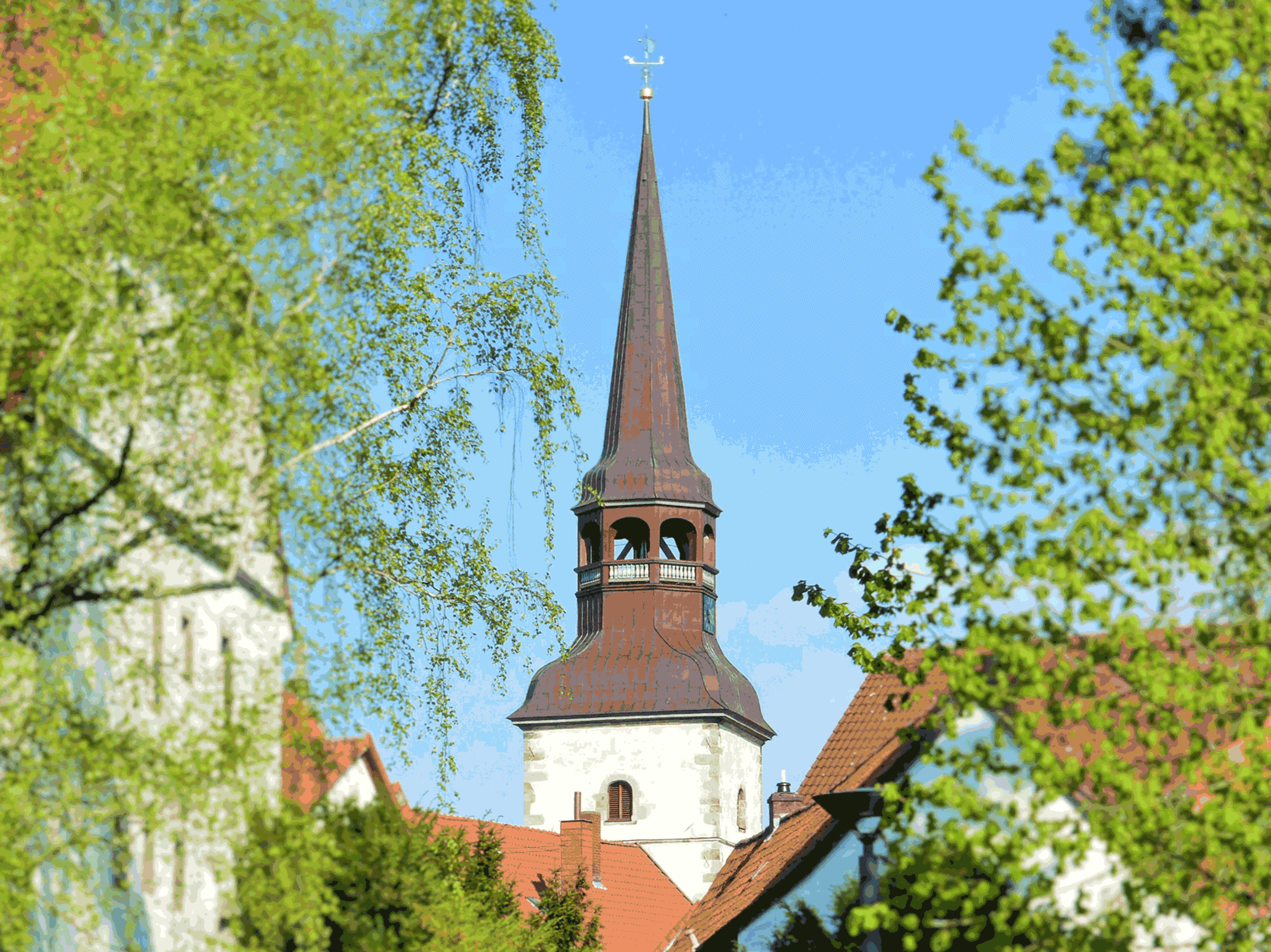 Hier befindet sich Gotteshaus. Der Turm reckt sich wie ein Zeigefinger zum Himmel.