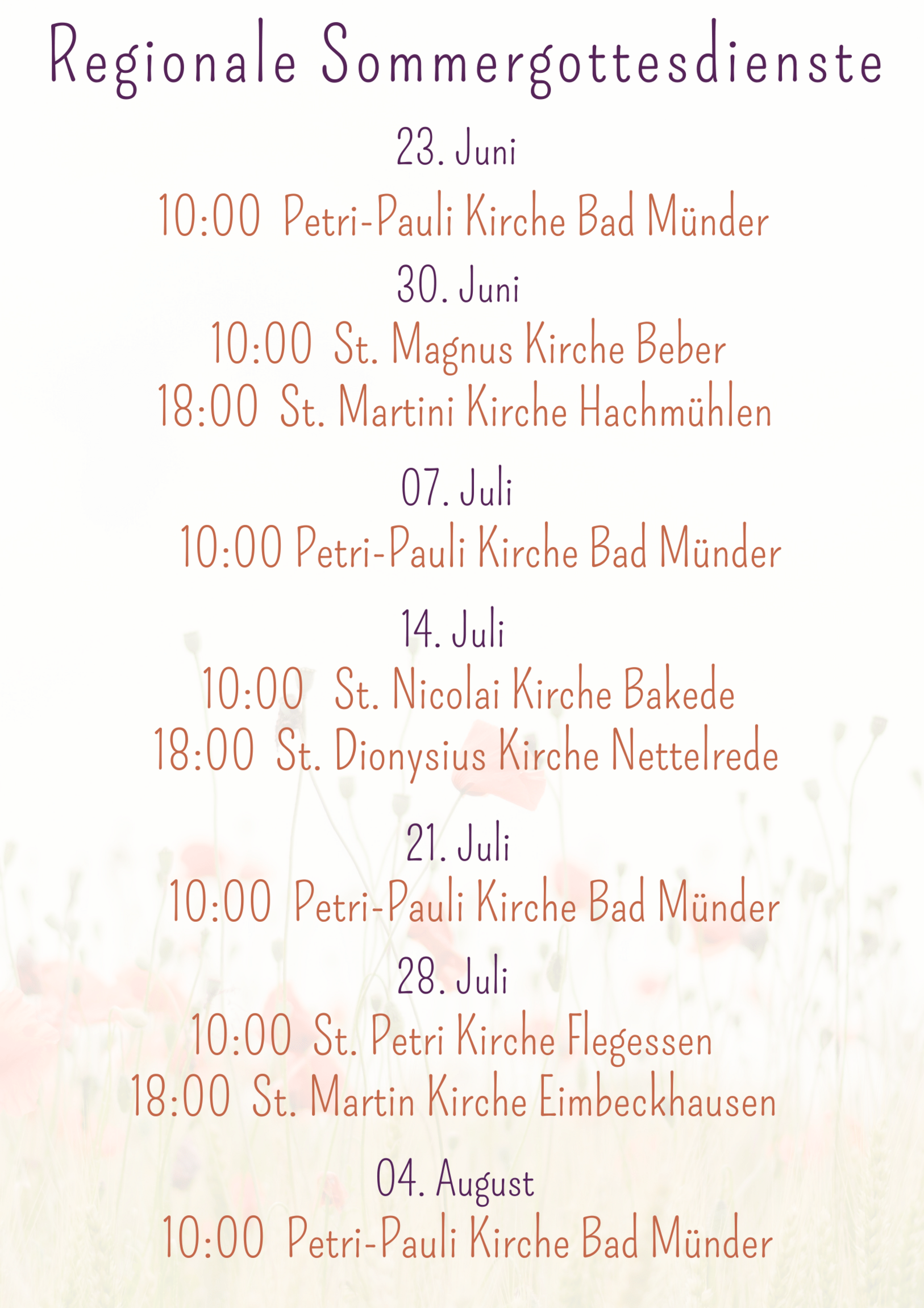 Die sieben evangelisch-lutherischen Kirchengemeinden in der "Region Bad Münder" laden an den Feriensonntagen gemeinsam zu Regionalen Sommergottesdiensten ein.