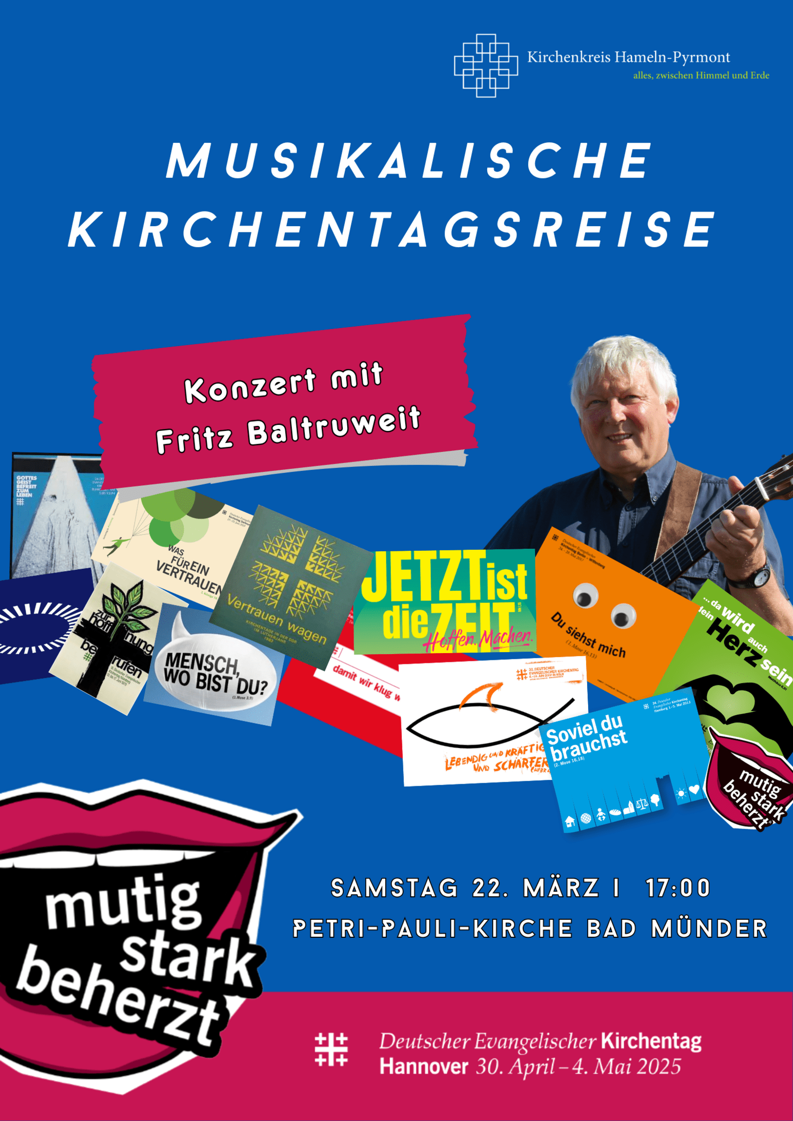 Dem Kirchenkreis Hameln-Pyrmont ist es gelungen, den Liedermacher und Sänger Fritz Baltruweit zu einem Konzert einzuladen, und zwar nach Bad Münder (ist ja auch am nächsten an Hannover dran 😉).