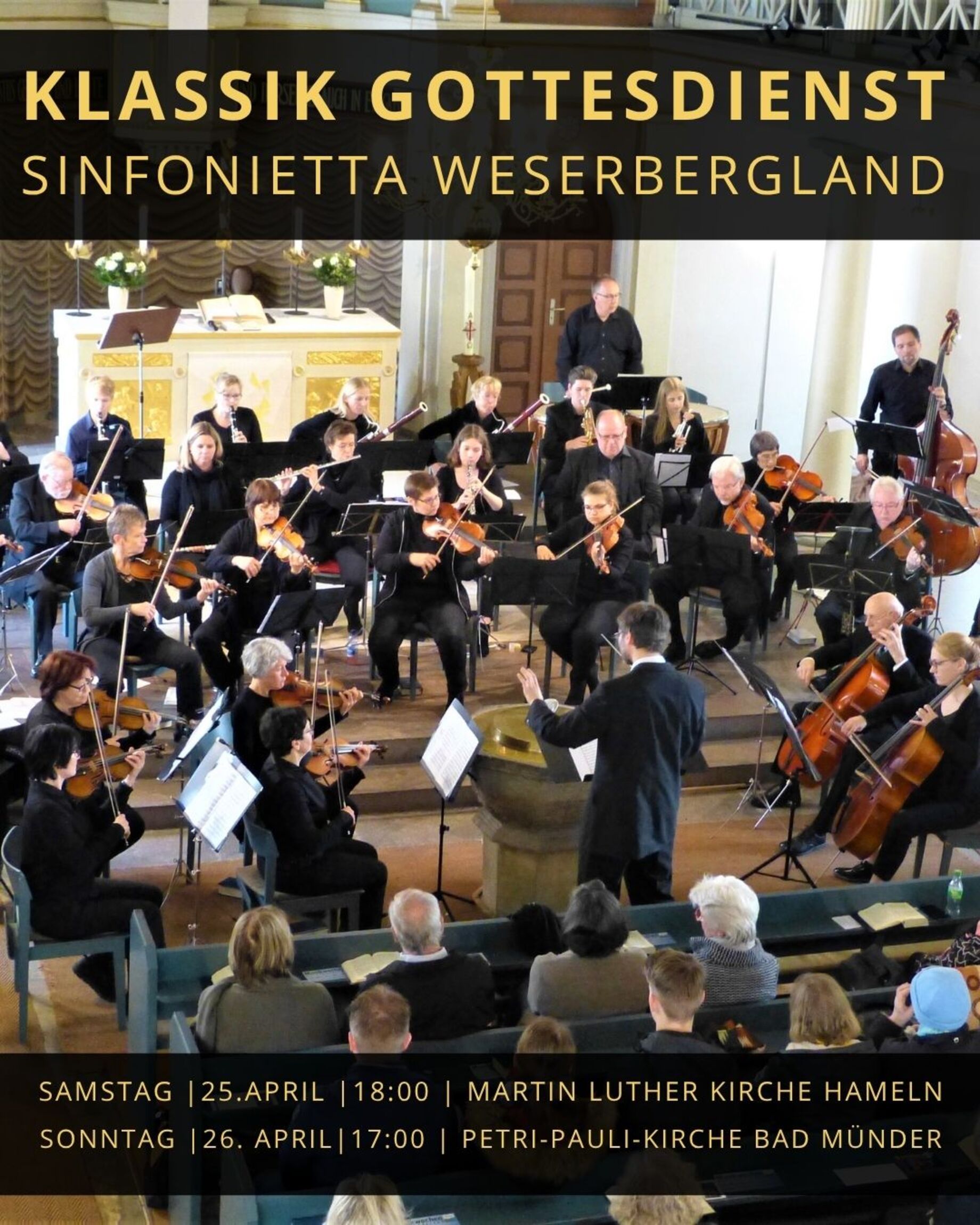 Die Gottesdienste mit der Sinfonietta Weserbergland finden am Samstag, dem 25. April, um 17 Uhr in der Martin-Luther-Kirche Hameln sowie am Sonntag, dem 26. April, um 17 Uhr in der Petri-Pauli-Kirche Bad Münder statt. Die Predigt hält Pastor Benjamin Westerkamp (Hameln) bzw. Pastor Dietmar Adler (Bad Münder).