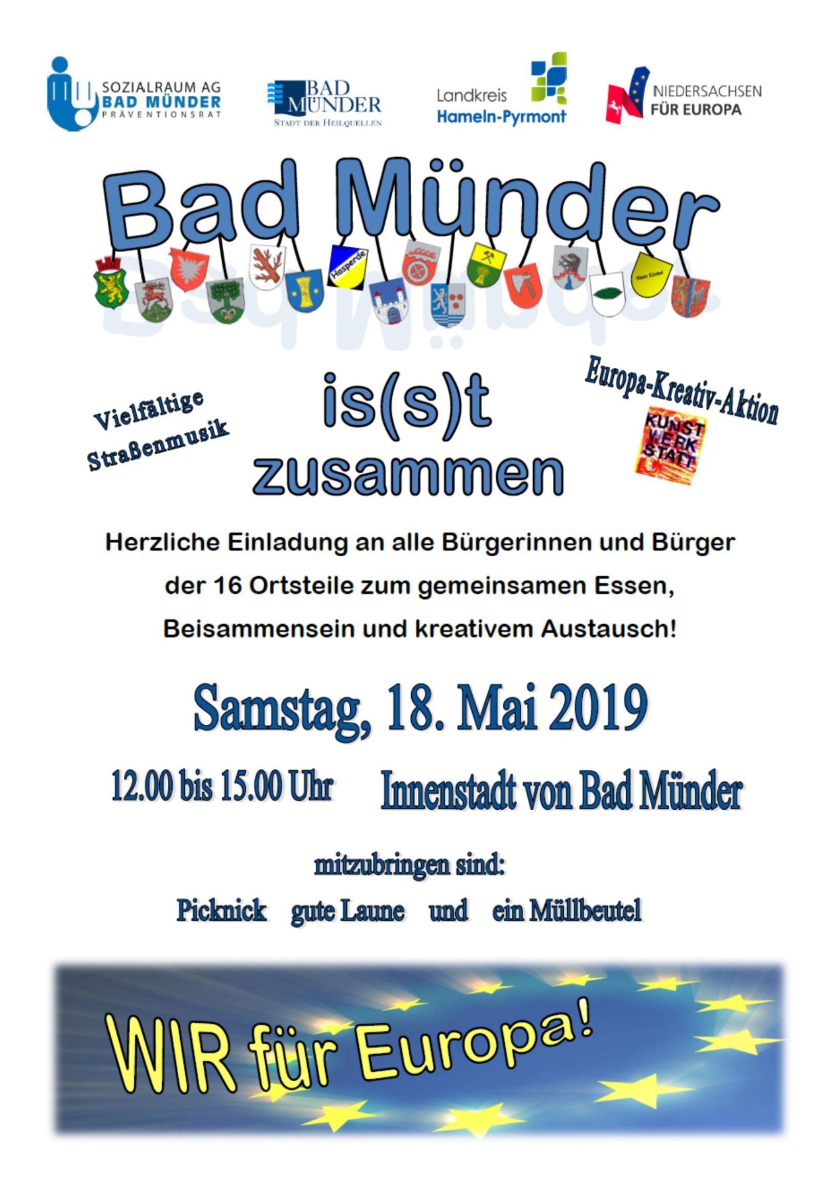 Unter dem Motto „Wir für Europa. Bad Münder is(s)t zusammen!“ sind Menschen aus allen 16 Ortsteilen der Stadt herzlich am Samstag, 18.05.2019 eingeladen, sich zu einem gemeinsamen Picknick und zu kreativen Aktionen zu treffen.